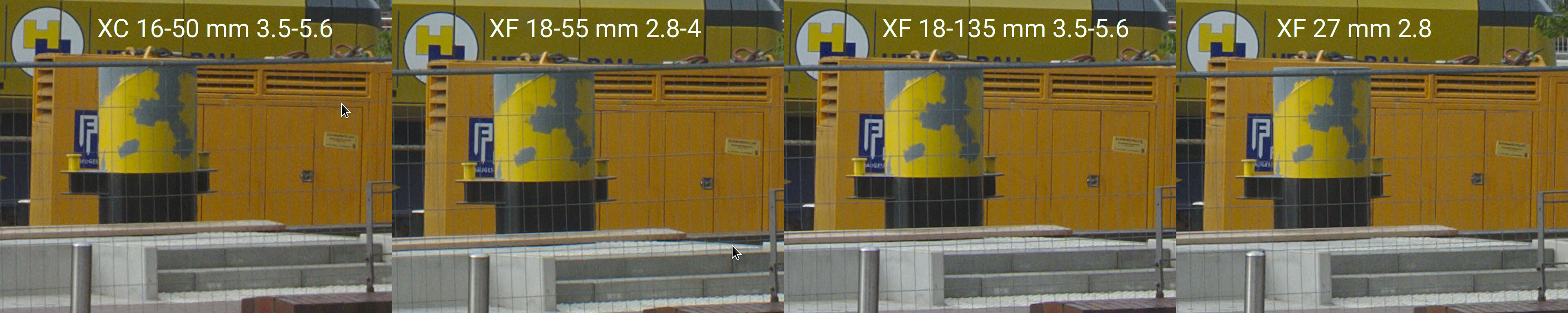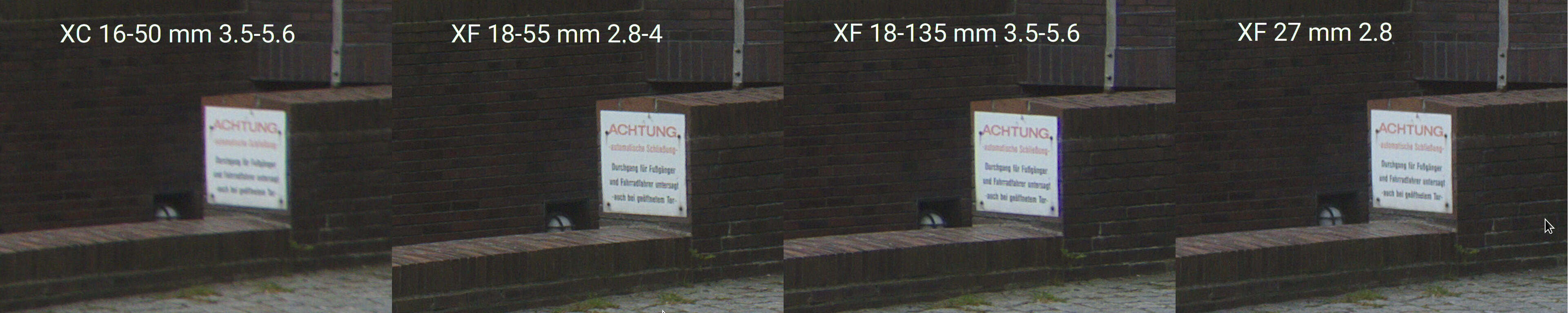 And indeed, the XC 16‑50 is noticeably blurry this time, with the other three lenses similarly sharp. The warning sign also highlights color fringes on the transitions from the bright white sign to the dark background. These chromatic aberrations are almost invisible on the XF 18‑55, and mild on the XF 18‑135 and XF 27.