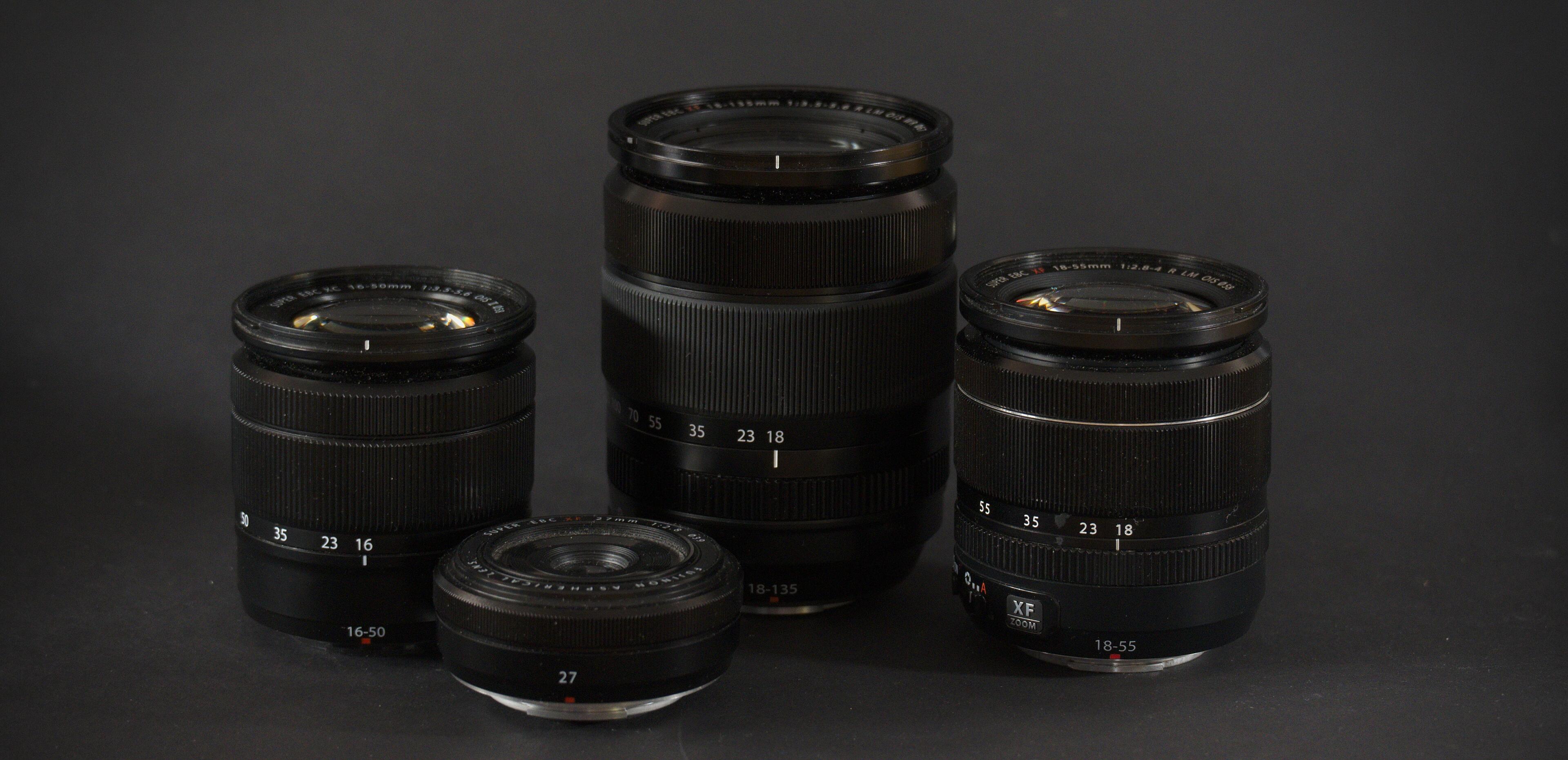 The XC 15‑45 is out, because the zoom ring is not turn-to-zoom like any other zoom lens. I tried it; I couldn't stand it. The XF 16‑55 is out because it is just too expensive and big for me. A bag of primes is not what I want, but I included the XF 27, because that's what I happened to have at hand. All of the above prices are used prices as of early 2019 in Germany.