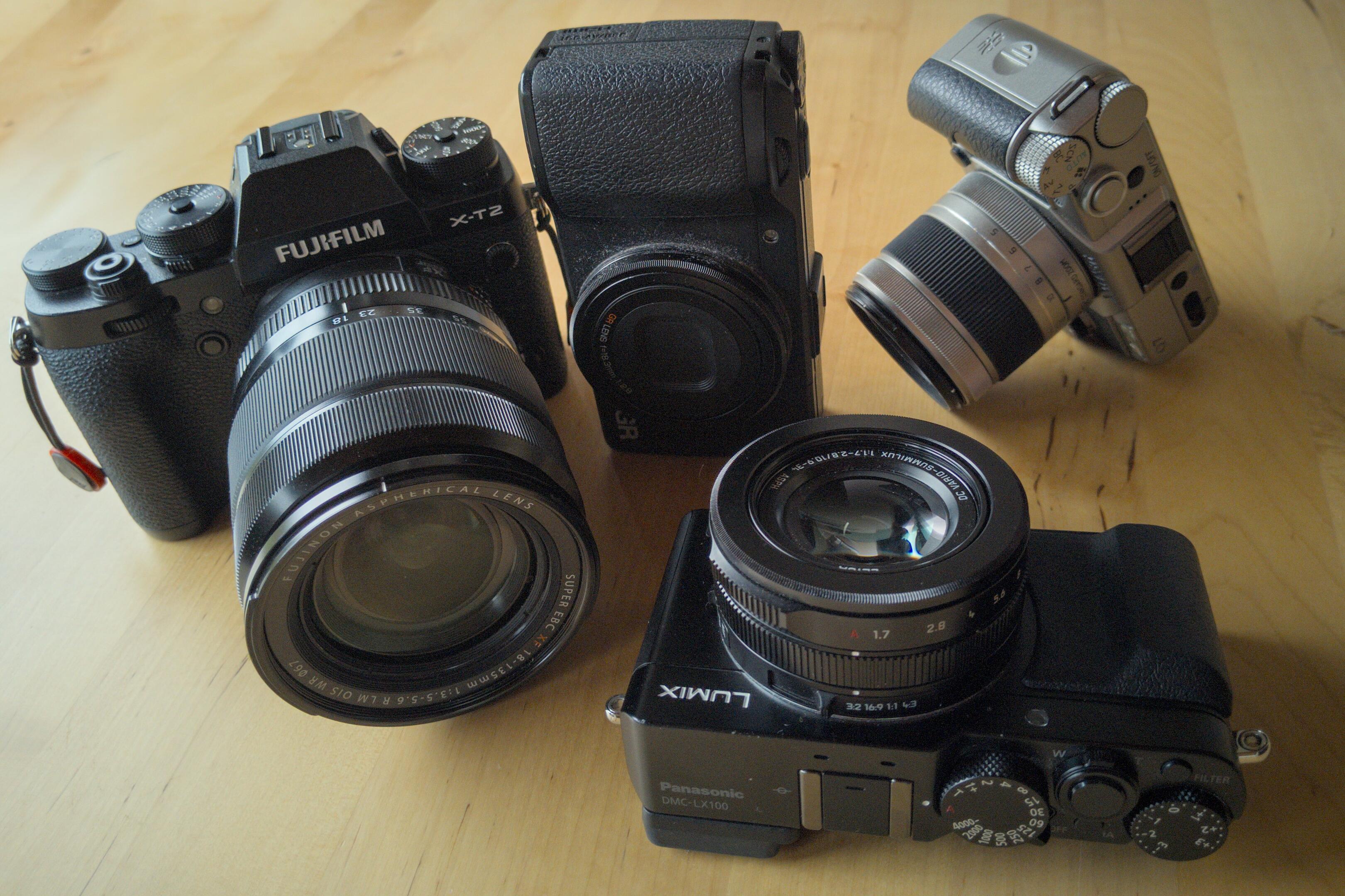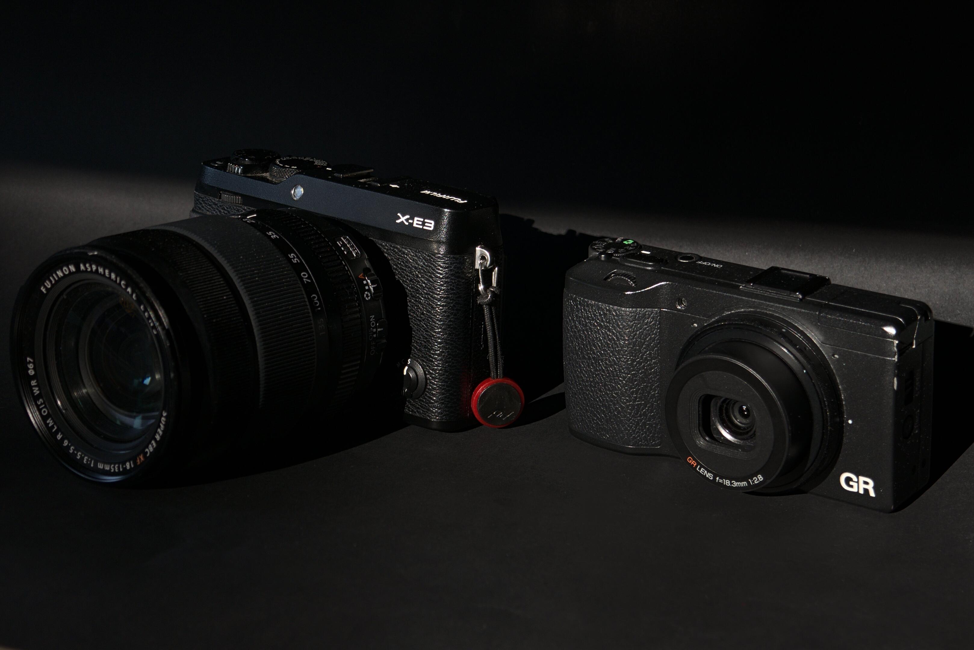 The X-E3 is a mirrorless camera, which means it's small. It is a very recent camera with a modern sensor. It's a rangefinder-style camera with the viewfinder in the top left. So it doesn't obscure my whole face when I lift it to my eye.